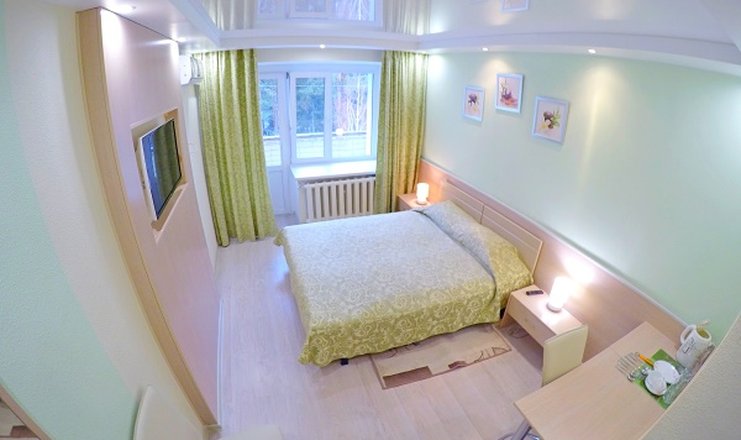В номере: стол, 2 стула, журнальный столик, шкаф-купе, кондиционер, посуда, телевизор, холодильник, электрочайник, двуспальная кровать (ширина 160 см).