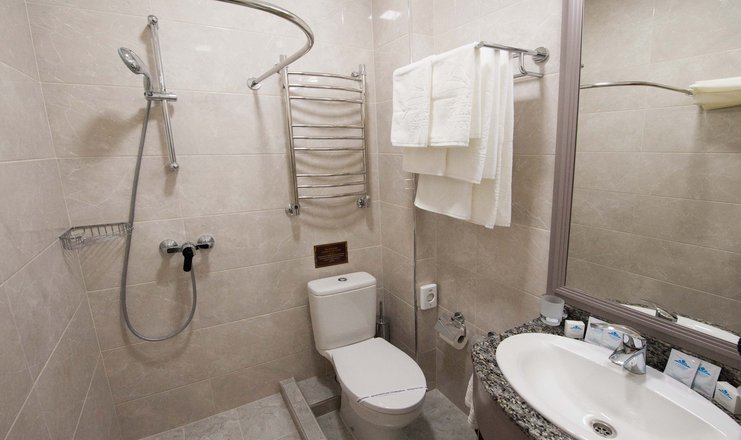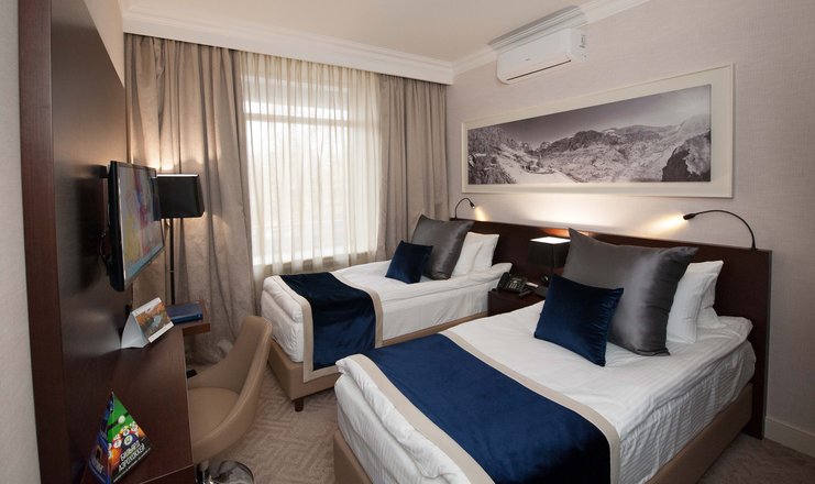 В номере: кровать двуспальная, стол, столик туалетный, стулья, гладильная доска, диван, набор посуды, сейф, сплит-система, телевизор, утюг, холодильник, электрочайник
