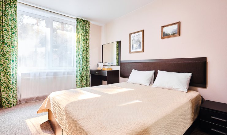 В номере: вешалка, зеркало, кресла, кровать двуспальная, прикроватные тумбочки, столик журнальный, столик туалетный, шкаф, мини-холодильник, телевизор ЖК, телефон, чайный набор посуды, электрочайник